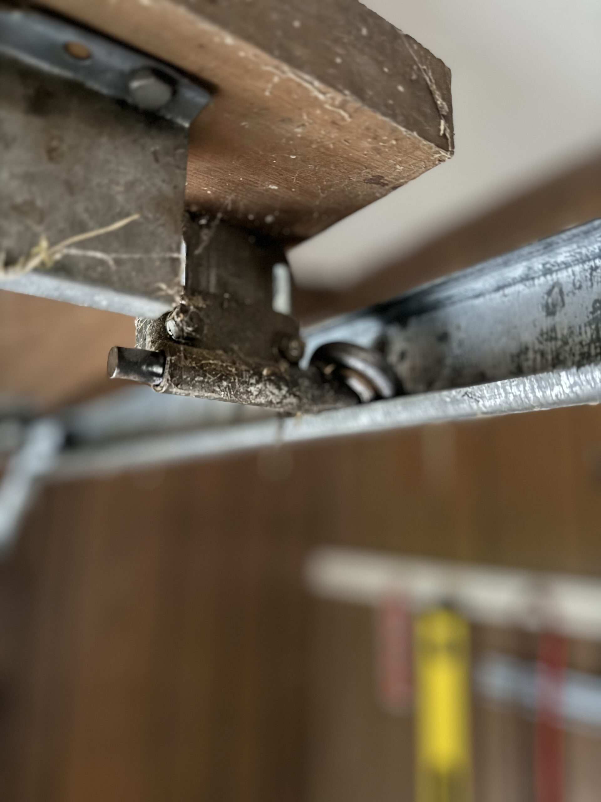 Look at the rollers on your hinges. If they're cracked, chipped, discolored, or have visible flat spots — they're past due. Steel rollers with orange rust are a sign of bearing failure.